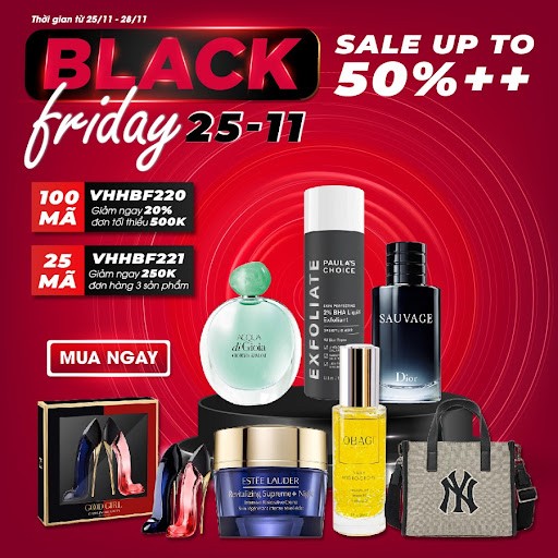 Hưởng ứng ngày hội Black Friday sale lớn nhất năm, Vua Hàng Hiệu tổ chức chương trình khuyến mãi cho toàn sàn thương mại điện tử. Mọi mặt hàng đều được ưu đãi giảm giá lên tới 50%. Thời điểm không thể hợp lí hơn để mua sắm đồ thời trang, làm đẹp, chăm sóc da, túi xách,... với mức giá hời nhất.