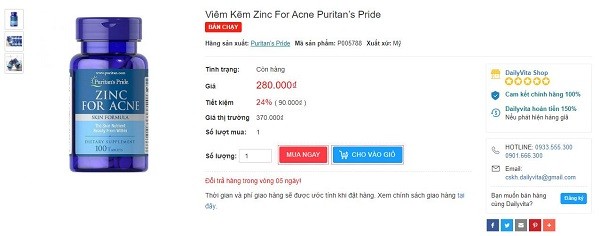 Viên uống kẽm Zinc For Acne Puritan's Pride hiện đang được bán trên thị trường với giá dao động khoảng 280.000 – 370.000đ. Giá sản phẩm có thể dao động khác nhau tùy vào từng địa điểm bán cũng như các chính sách bán hàng riêng. Bạn có thể dễ dàng mua sản phẩm tại nhiều địa chỉ uy tín trên thị trường. Tuy nhiên, hiện nay viên uống kẽm Zinc for Acne đã có hàng giả, hàng nhái, nên bạn cần cẩn thận hơn khi mua hàng.
