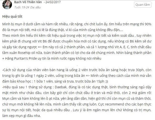 - Đánh giá viên uống kẽm Zinc For Acne Puritan's Pride từ người dùng