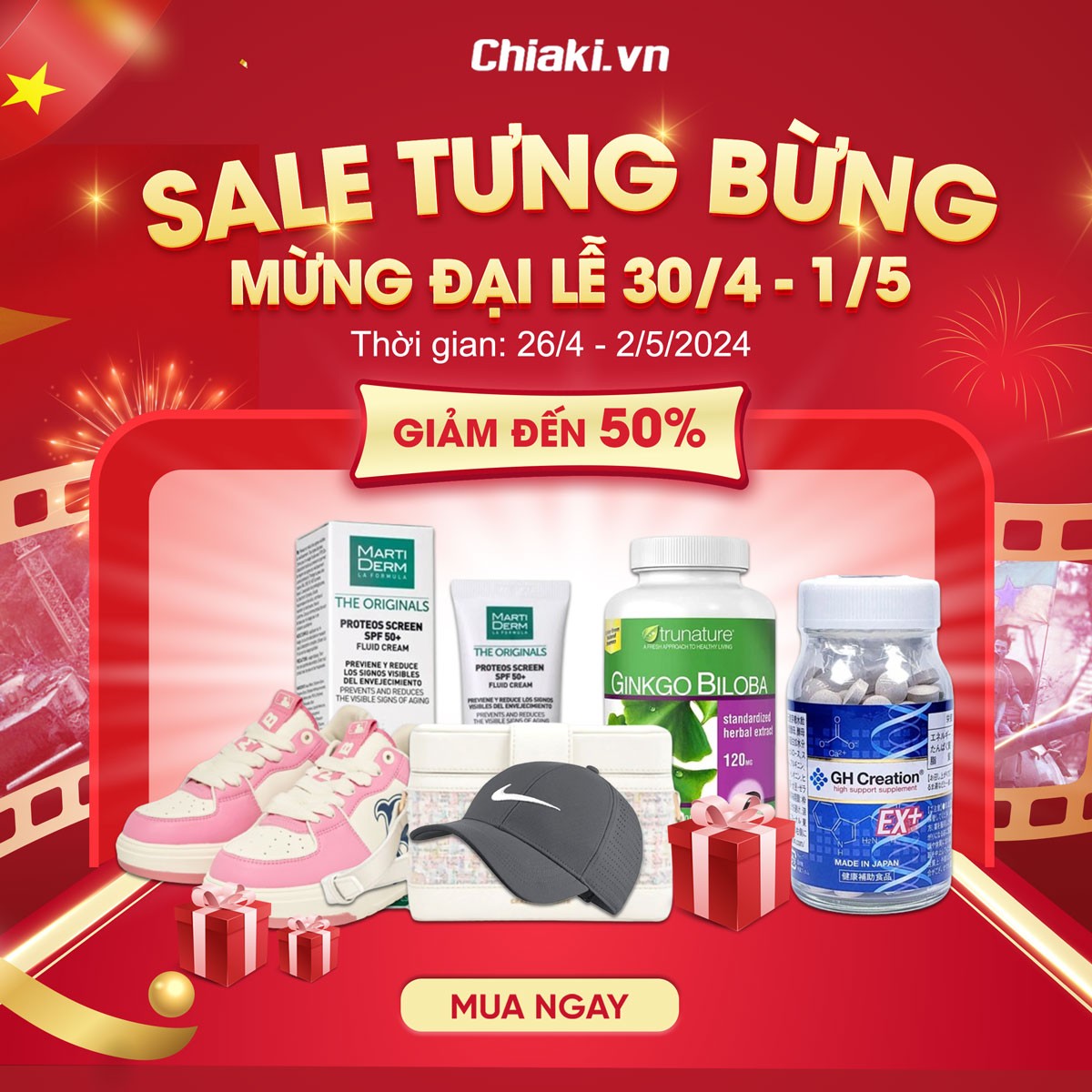 Từ ngày 26/4 - 2/5/2024, Chiaki bùng nổ ưu đãi, Sale lớn lên tới 50% các sản phẩm như: Thực phẩm chức năng, mỹ phẩm, sản phẩm cho mẹ và bé, thời trang, đồ gia dụng, nhà cửa đời sống và các sản phẩm chăm sóc thú cưng với mức giá “siêu hời”. Đây là cơ hội có 1-0-2 để bạn sở hữu những món đồ yêu thích, chuẩn bị cho những chuyến du lịch hè sắp tới. Đừng bỏ lỡ cơ hội trải nghiệm mua sắm thú vị và tiết kiệm ngay tại Chiaki hôm nay nhé!. Chương trình diễn ra trên website hoặc ứng dụng Chiaki.vn.