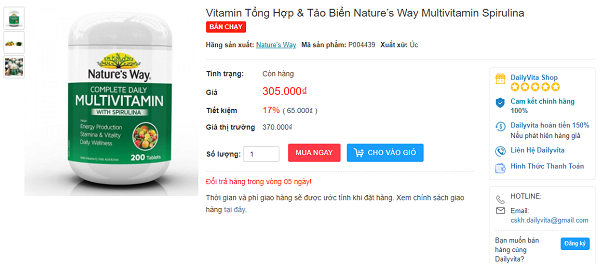 Vitamin tổng hợp Nature’s Way Multivitamin Spirulina hiện đang được bán tại Dalyvita.vn với mức giá ưu đãi là 305.000/hộp, theo đó mức giá trên thị trường là 370.000đ/hộp. Do đó, khi mua hàng tại Dailyvita bạn sẽ tiết kiệm được 17% giá thành của sản phẩm.