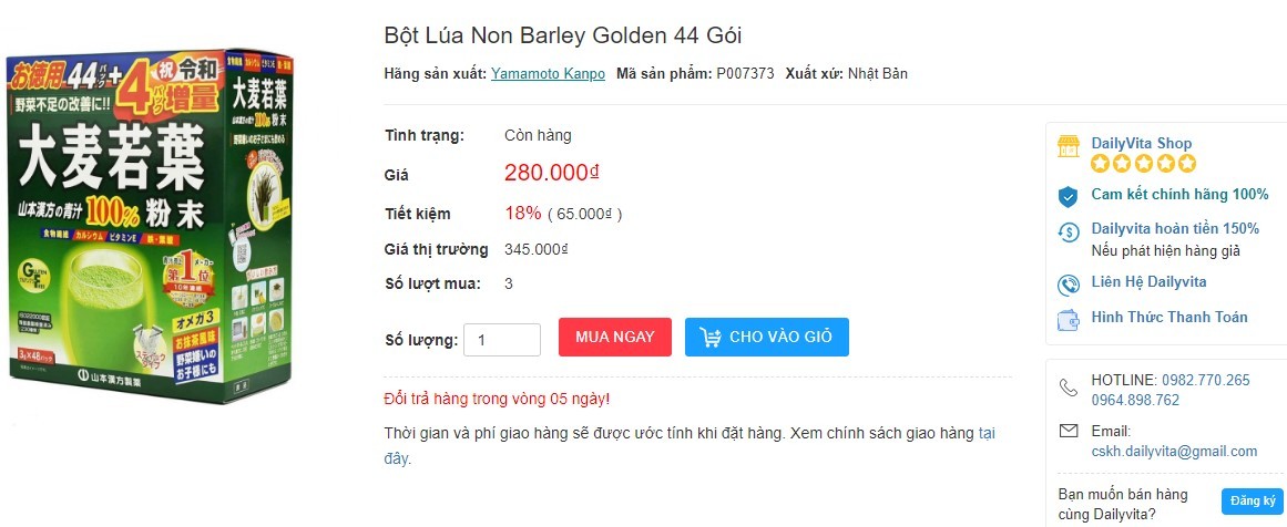 Được biết Dailyvita.vn là trang thương mại điện tử cung cấp bột mầm lúa mạch non Barley uy tín đảm bảo chính hãng 100% với giá niêm yết luôn ưu đãi hơn rất nhiều so với giá thị trường. Hiện nay bột mầm đậu nành Barley được bán trên trang web dailyvita.vn với giá 280.000 đồng, thấp hơn đến 65,000 so với rất nhiều địa chỉ khác. DailyVita.vn cũng hỗ trợ thanh toán khi nhận hàng, tư vấn nhiệt tình tận tâm nên bạn cũng không cần quá lo lắng. Để mua hàng bạn nhấn vào đường dẫn dưới đây: